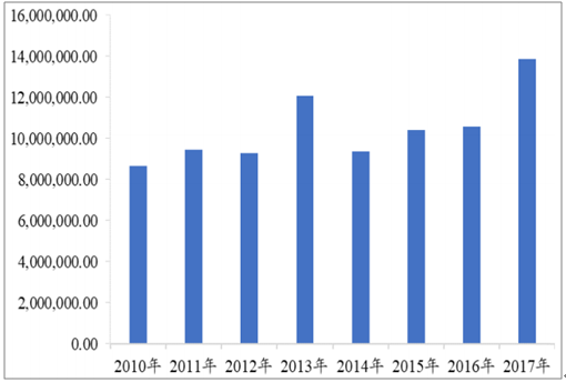 2010-2017年我國進口鉻礦數(shù)量變化(噸)