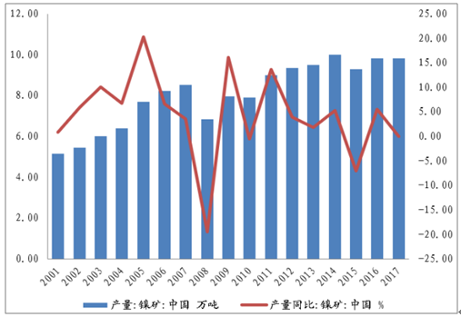 中國鎳礦產(chǎn)量(萬噸)及同比(%)