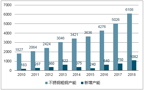 我國不銹鋼產(chǎn)能及新增產(chǎn)能變化(萬噸)