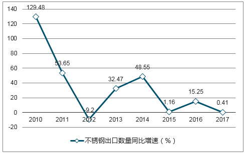 2009-2017年,我國不銹鋼出口數(shù)量年均復(fù)合增長率為28.37%;但近年來增速放緩,2017年實現(xiàn)不銹鋼出口數(shù)量395.30萬噸,同比增長0.41%,創(chuàng)歷史新高。據(jù)中國特鋼企業(yè)協(xié)會不銹鋼分會最新數(shù)據(jù),2018年一季度全國出口不銹鋼102.4萬噸,與2017年一季度同比增加12.3萬噸,增長13.7%。