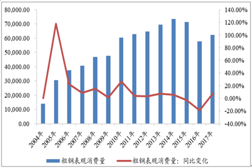 2017年,我國粗鋼表觀消費量為62,352.57萬噸,同比增長7.76%,創(chuàng)10年來最高增速;不銹鋼表觀消費量自2008年后持續(xù)高速增長,但近年來增速放緩,2017年,不銹鋼表觀消費量創(chuàng)歷史最高水平1984.68萬噸,增速為5.37%。