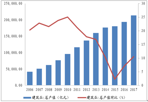 2006-2017年我國建筑業(yè)總產(chǎn)值(億元)及總產(chǎn)值同比(%)