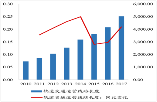 我國城市軌道交通運營里程數(shù)同比變化(%)